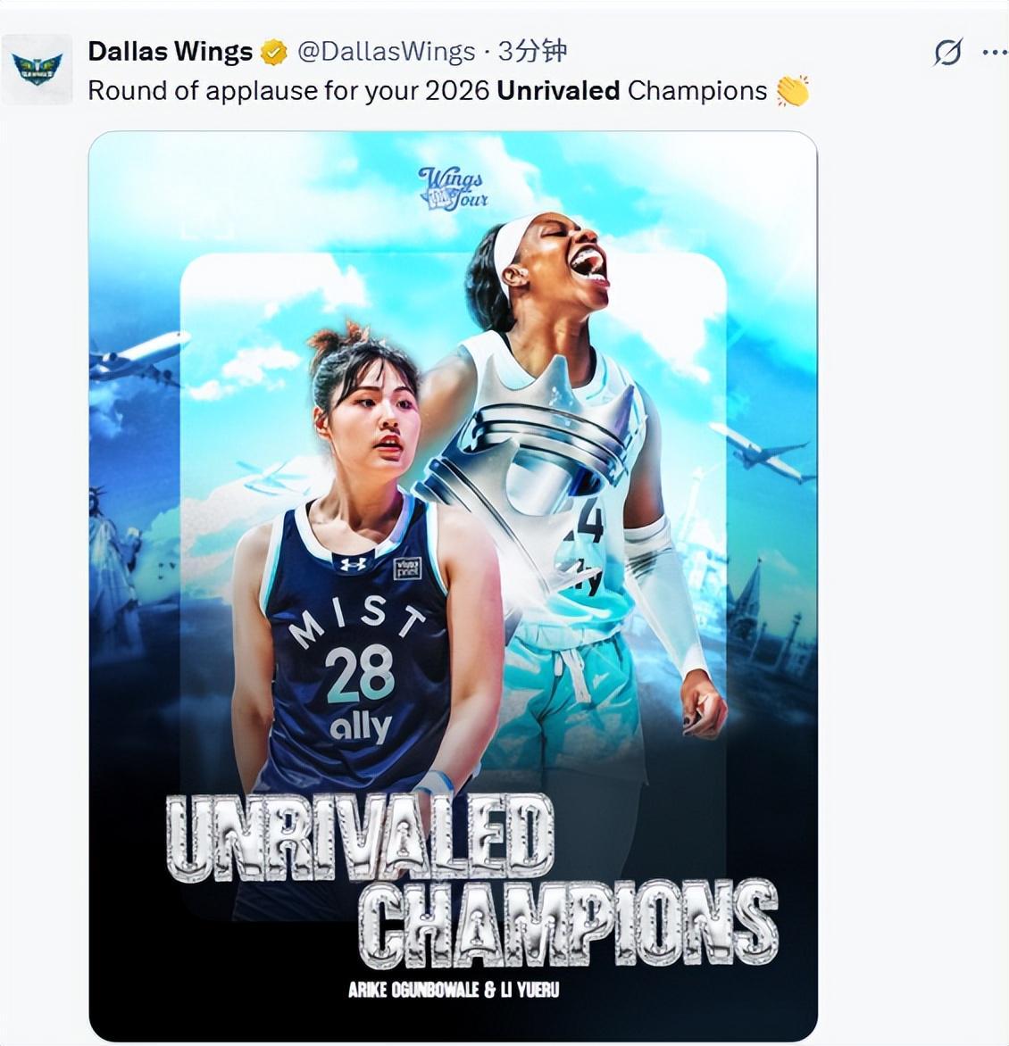 北京时间3月5日,中国球员李月汝所效力的迷雾队夺得了2026年UNRIVALED联赛冠军,她将与队友们分享60万美元的奖金。迷雾队在决赛中以80-74击败幽灵队。